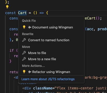 Documentation generation is a feature that allows you to use VSCode's "quick fix" menu to generate JS/TS Docs for a given method.